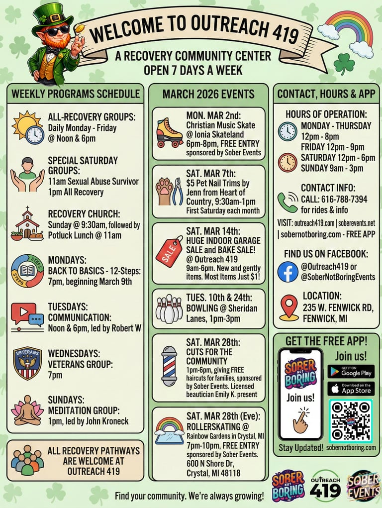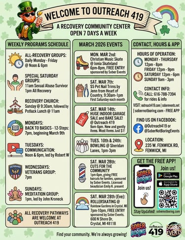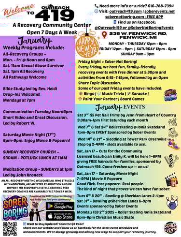 At Outreach 419, all pathways are welcome. That means we honor and respect recovery from AA, NA, Celebrate Recovery, SMART Recovery, faith-based journeys, harm reduction, medication-assisted treatment, and more. If you're on the path to healing, you're welcome here.