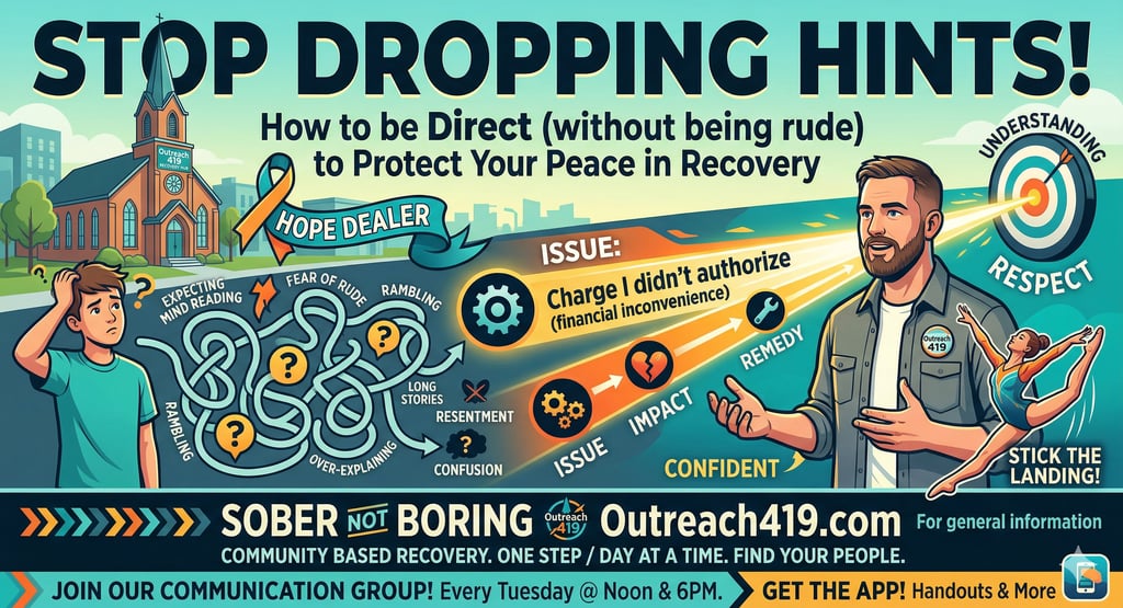 If you want to learn more practical tools for protecting your peace and having better conversations, we want you in the room with us. Join us for our Communication Group every Tuesday at the Outreach 419 Recovery Hub.