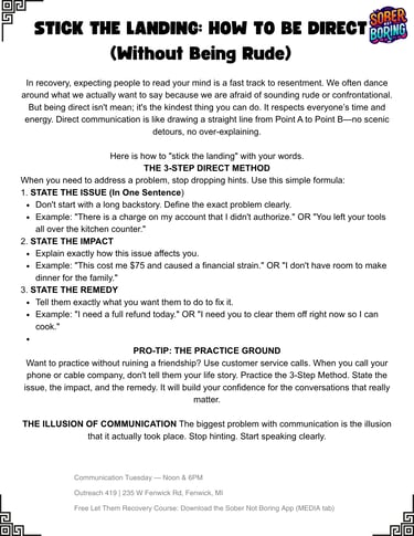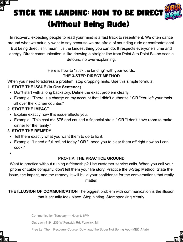Many of us struggle to be direct because we are terrified of coming across as rude, mean, or confrontational. In active addiction, a lot of us relied on manipulation, dodging the truth, or keeping quiet to survive. But when we get sober, we have to learn a whole new way of talking to people.