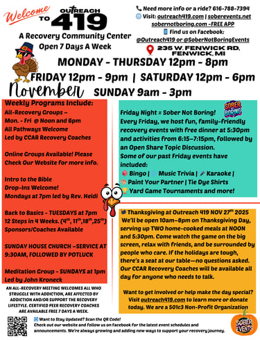 At Outreach 419, all pathways are welcome. That means we honor and respect recovery from AA, NA, Celebrate Recovery, SMART Recovery, faith-based journeys, harm reduction, medication-assisted treatment, and more. If you're on the path to healing, you're welcome here.