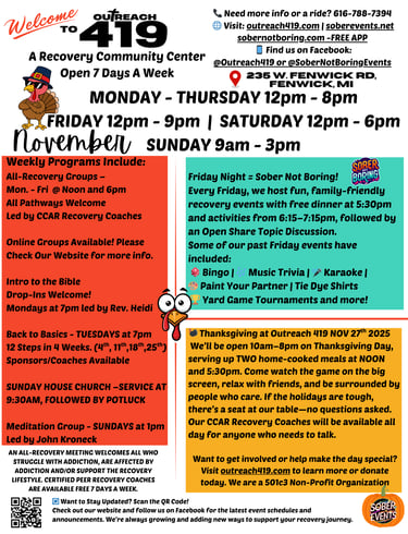 Outreach 419 is powered by Sober Events, a registered 501(c)(3) nonprofit organization dedicated to creating a supportive and stigma-free recovery community. As the nonprofit arm, Sober Events allows us to provide impactful programs, events, and resources to those in recovery and the broader community. All donations made to Outreach 419 go through Sober Events and are fully tax-deductible, ensuring that every contribution directly supports our mission of connection, empowerment, and recovery.